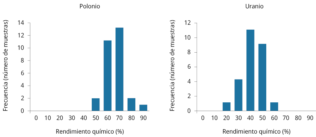 Para comprobar la idoneidad del método se evaluó el rendimiento químico en cada muestra mediante la técnica de dilución isotópica, determinando la recuperación del trazador añadido al comienzo del procedimiento. La Figura 3 refleja la frecuencia (número de muestras) frente al rendimiento químico (agrupado en incrementos del 10 %) para el polonio y uranio en las muestras analizadas.