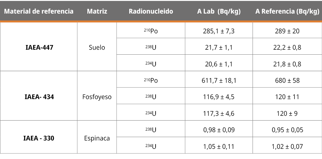 El IAEA-447 es un material de referencia diseñado para la determinación de radionucleidos antropogénicos y naturales en suelo, entre ellos 210Po (valor medio 423 ± 10 Bq/kg), 238U (valor medio 22,2 ± 0,8 Bq/kg) y 234U (valor medio 21,8 ± 0,8 Bq/kg). El IAEA-330 es un material de referencia certificado para radionucleidos en espinaca en polvo con un valor medio para 238U de 0,95 ± 0,05 Bq/kg, y de 1,02 ± 0,07 Bq/kg para 234U. Por último, el IAEA-434 es un material de referencia de radionucleidos presentes en fosfoyeso, certificado para 210Pb (con un valor medio de 680 ± 58 Bq/kg), 238U (con un valor medio de 120 ± 11 Bq/kg) y 234U (con un valor medio de 120 ± 9 Bq/kg).