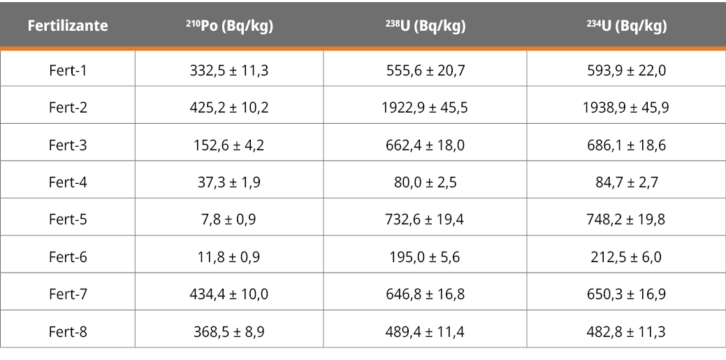 En la Tabla 2 se muestran las concentraciones de actividad de polonio y uranio obtenidas en 8 muestras de fertilizantes utilizados en Uruguay. Los resultados obtenidos se encuentran por encima de la MDA para los tres radionucleidos de interés, y la amplitud del rango depende principalmente del tipo y origen del fertilizante. Los valores encontrados son del mismo orden que los reportados en la bibliografía (Plaza et al., 2006).
