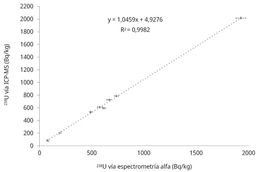 Los resultados de 238U (Bq/kg) obtenidos en fertilizantes por espectrometría alfa fueron comparados con los valores de U en ppm obtenidos por Espectrometría de Masas con Plasma Acoplado Inductivamente (ICP-MS). Estos valores se pueden comparar ya que, dada la abundancia isotópica del uranio natural, casi el 100 % del uranio reportado por la técnica de ICP-MS es de hecho 238U, pudiendo convertir los ppm de uranio a Bq/kg.