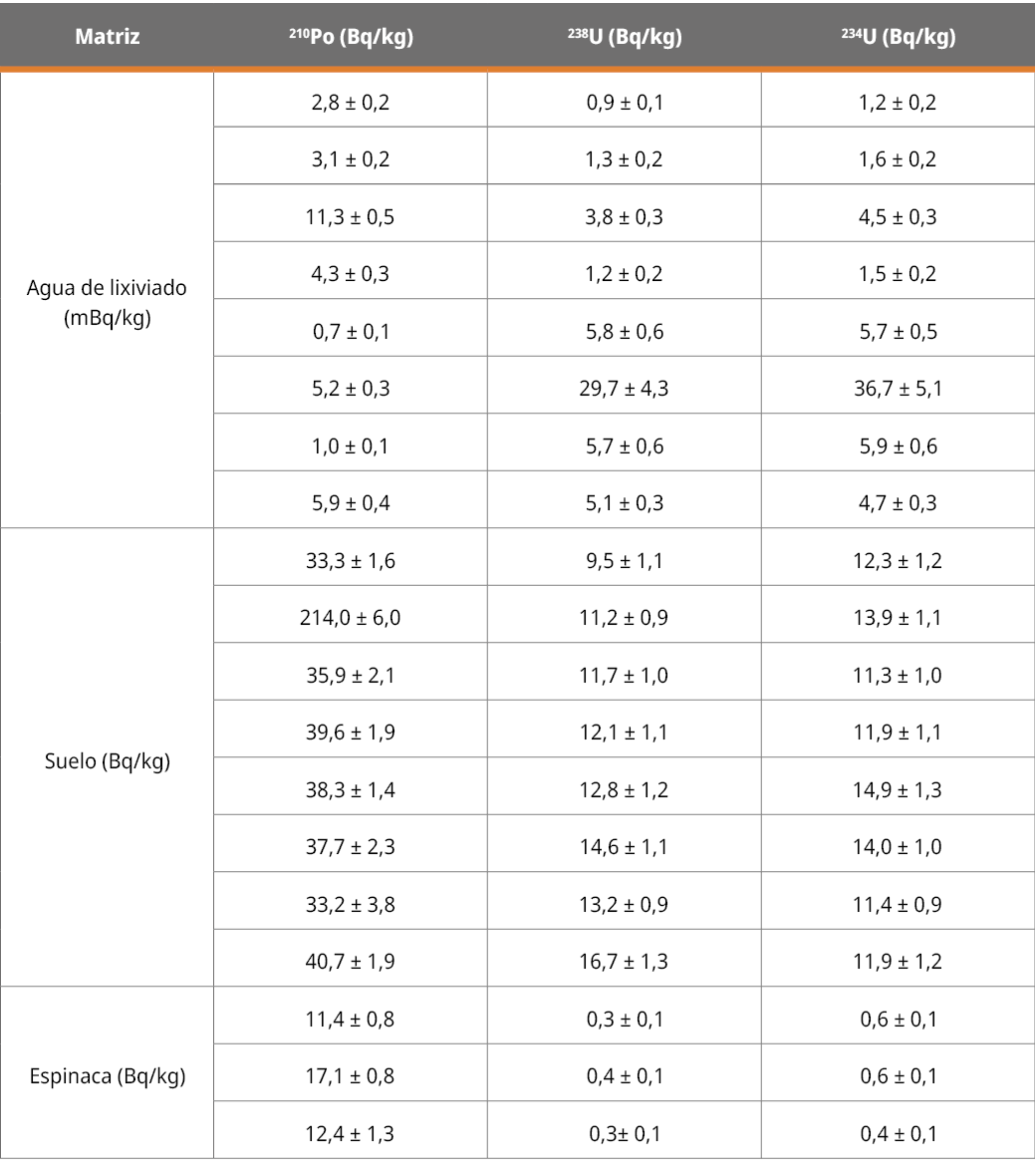 Tabla 3. Concentración de actividad de 210Po, 238U y 234U en muestras de agua de lixiviado (mBq/kg), suelo (Bq/kg, peso seco) y espinaca (Bq/kg, peso seco).