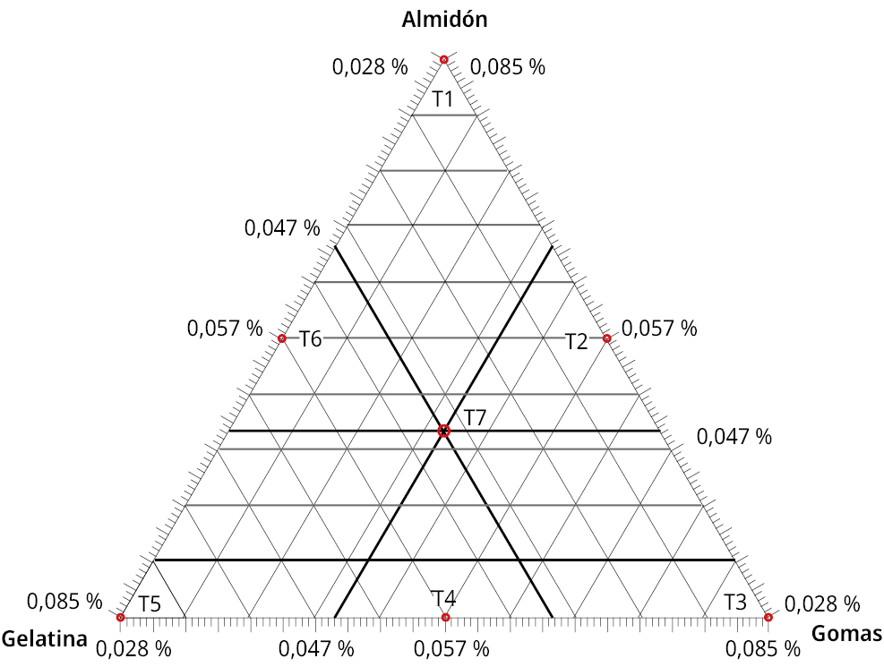 Se utilizó un diseño de mezclas de 3 factores (hidrocoloides en estudio: gelatina, almidón modificado y una mezcla de partes iguales de gomas guar y garrofín). La suma de los tres factores se mantiene constante e igual a 0,142 %, como se indica en el diagrama ternario (Figura 1). En la totalidad del trabajo, todas las concentraciones son expresadas en peso/peso.