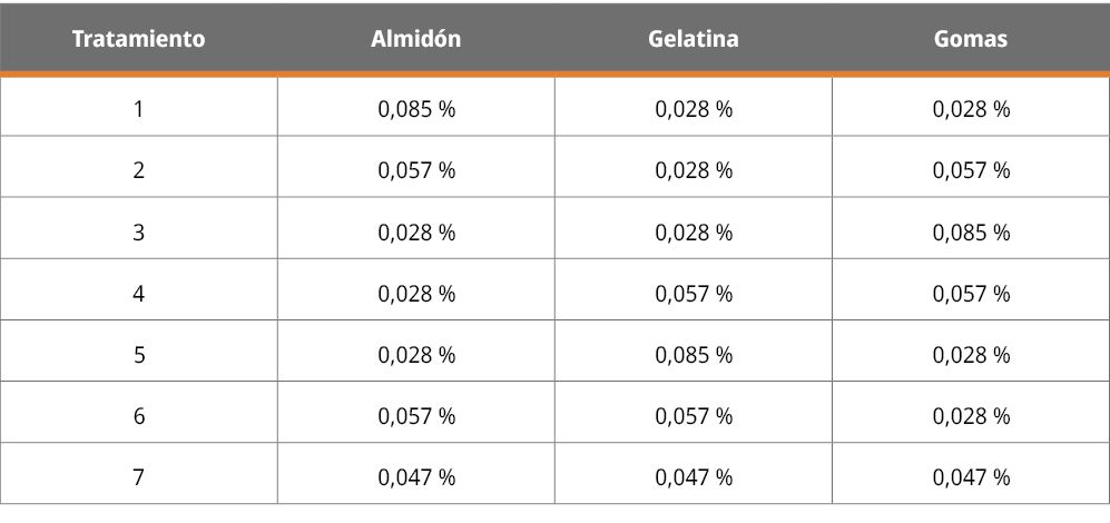 Tabla 1. Composición de almidón, gelatina y mezcla de gomas de los distintos tratamientos del diseño experimental.