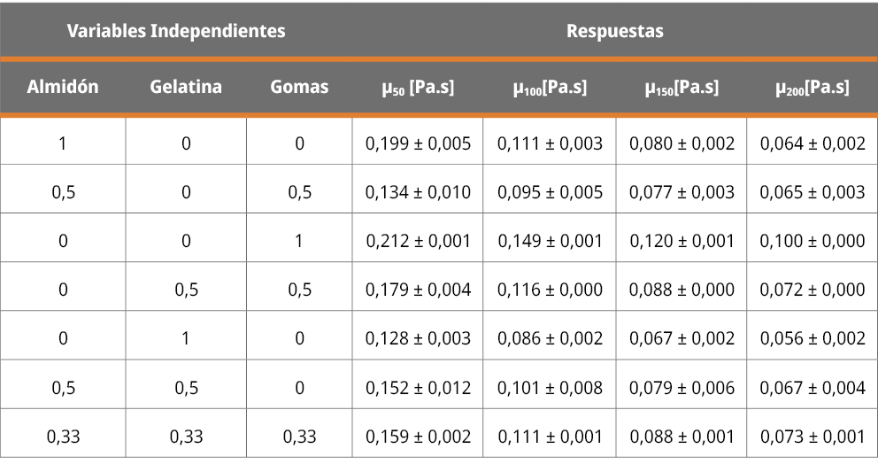 Se presentan en la Tabla 4 los valores medios experimentales registrados, junto a sus desviaciones estándar, para la viscosidad aparente a velocidades de corte 50, 100, 150 y 200 s-1, obtenidos a partir de las elaboraciones realizadas para cumplir con el diseño experimental planteado.