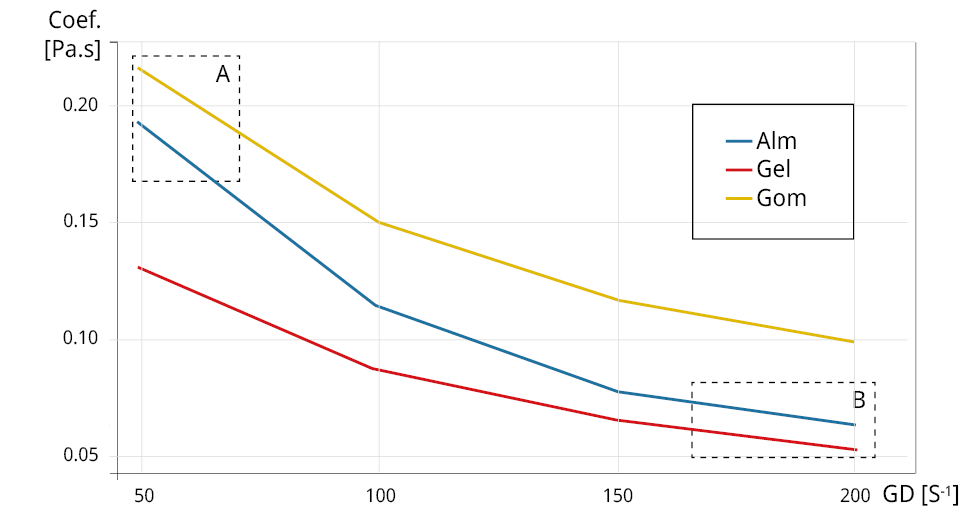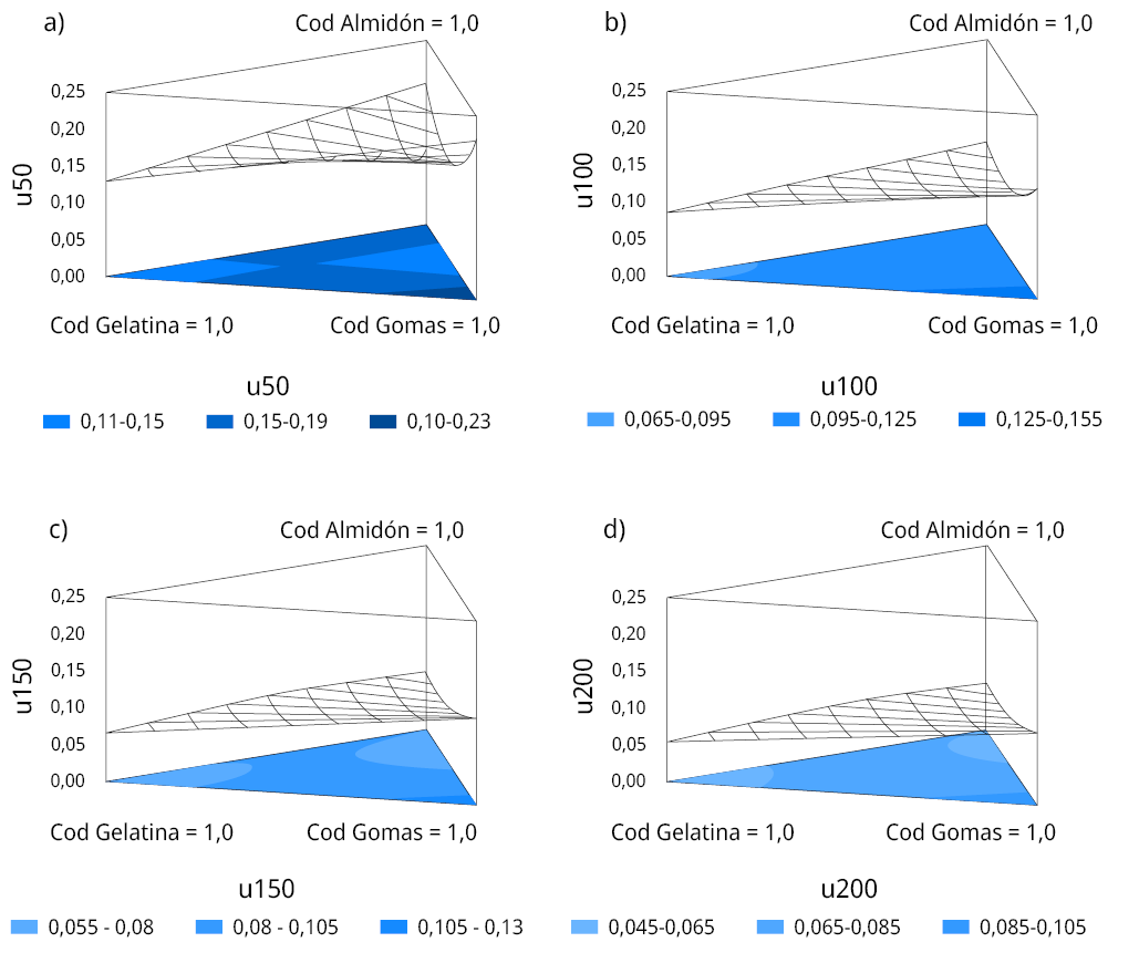 En cuanto a la interacción de a pares, la combinación almidón-gomas tiene efectos fuertemente antagónicos en todo el rango de gradiente analizado (término de mayor coeficiente negativo para μ50, Tabla 5), con una influencia muy marcada a bajos gradientes y disminuyendo al aumentar dicho gradiente. Por otro lado, se observa que la combinación almidón-gelatina solo tiene influencia para altos gradientes sobre la viscosidad aparente, mientras que la combinación gelatina-gomas no presentó efectos significativos en todo el rango.