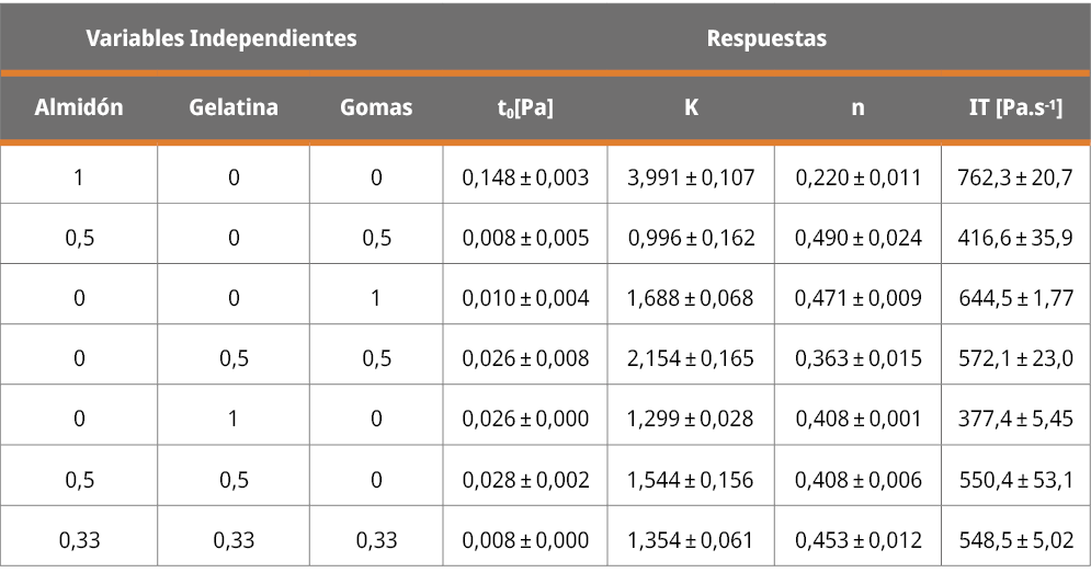 Se presentan en la Tabla 6 los valores medios y sus desvíos estándar para el índice de comportamiento (n), índice de consistencia (K), límite de fluencia (t0) e índice de tixotropía (IT), obtenidos a partir de los datos experimentales de las elaboraciones realizadas, según el diseño experimental planteado.