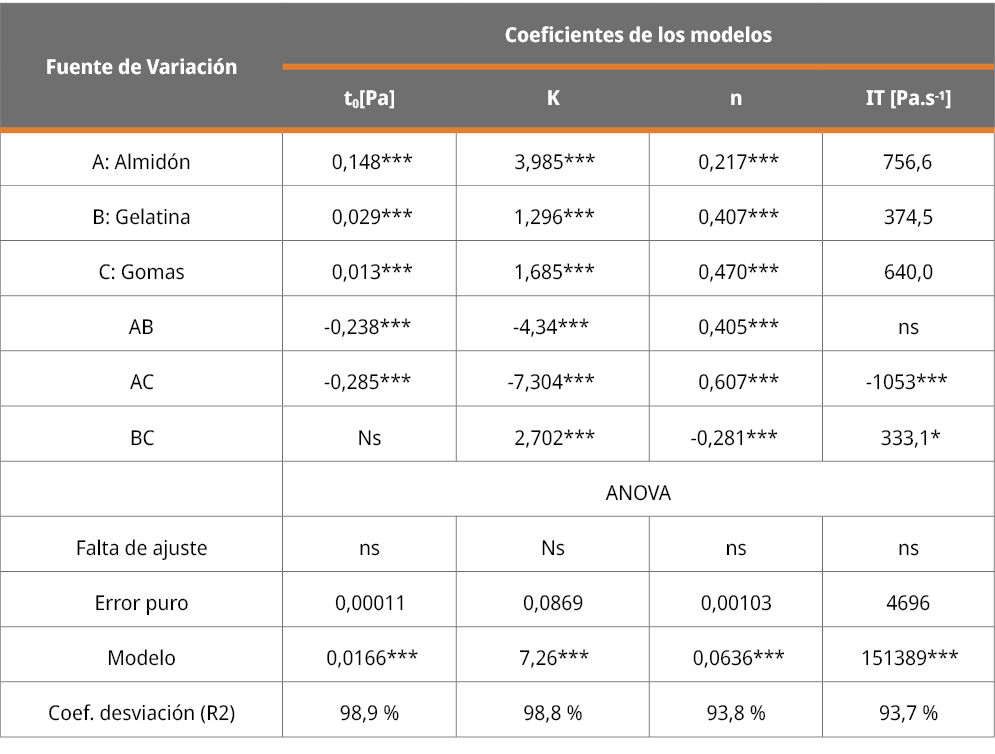 Además, se presentan los coeficientes obtenidos de las regresiones múltiples con polinomios de segundo grado, en función de las 3 variables del diseño estadístico experimental, para el límite de fluencia, índice de consistencia, índice de comportamiento e índice de tixotropía, junto con los del análisis de varianza y los estadísticos, falta de ajuste de los modelos, error puro y R2 (Tabla 7).