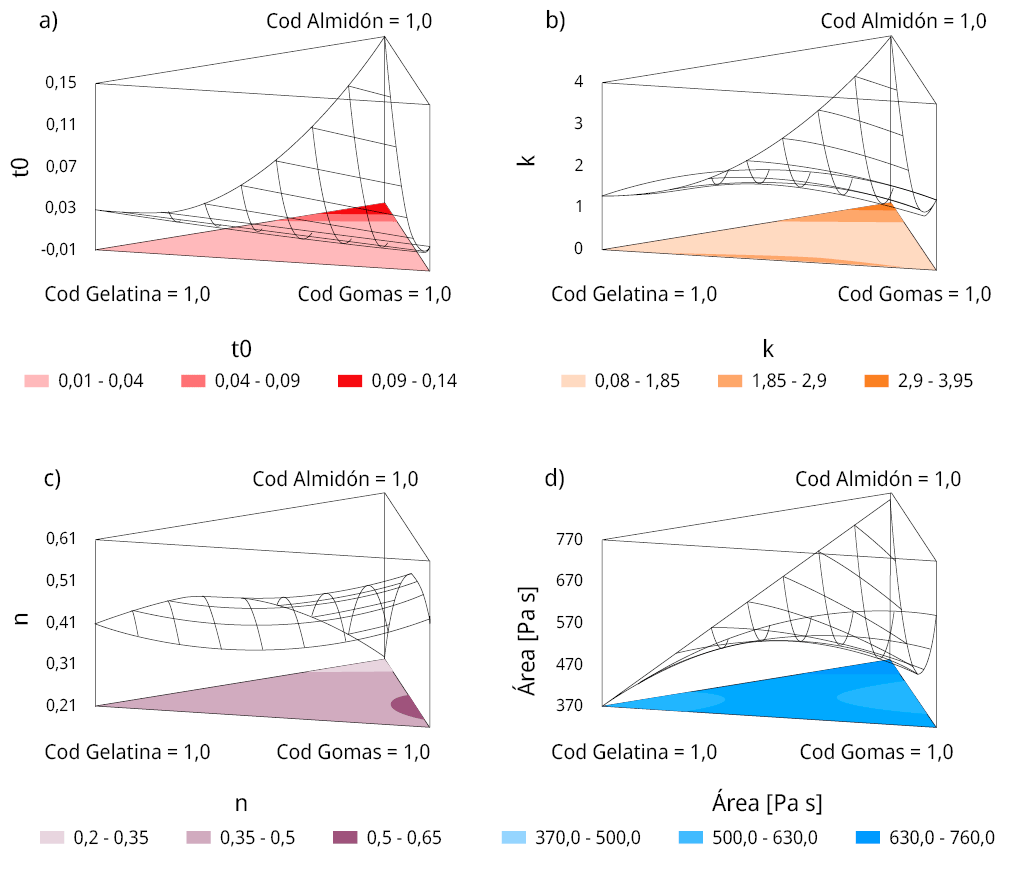 En lo que concierne al límite de fluencia, se observó que la concentración individual de todos los hidrocoloides influye directamente sobre este, en mayor medida el almidón modificado (alrededor de 5 y 13 veces más que la gelatina y las gomas, respectivamente), aunque su efecto resulta antagónico en combinación con los otros dos hidrocoloides. Este comportamiento ocasiona que para concentraciones determinadas de gelatina y gomas exista un valor dentro del rango de concentraciones de almidón que corresponda a un mínimo en el parámetro analizado. En la gráfica de superficie de respuesta se puede visualizar el comportamiento del t0, el cual se incrementa principalmente a medida que aumenta la concentración de almidón (Figura 4).