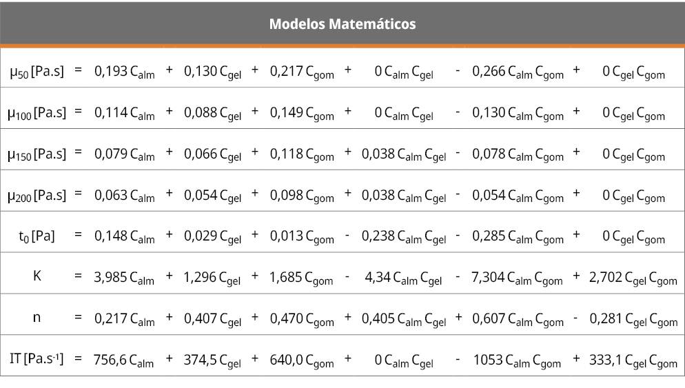Dichos modelos permitieron predecir los valores de viscosidad aparente y parámetros reológicos para una combinación de hidrocoloides que se encuentre dentro del rango estudiado de cada hidrocoloide, reemplazando directamente los valores de la fracción utilizada de cada hidrocoloide (variable).