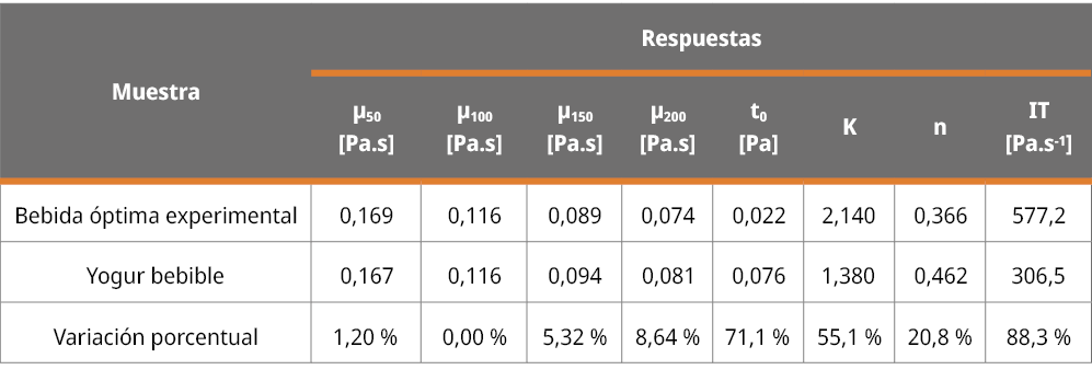 Se presentan los parámetros predichos por los modelos obtenidos para dicha composición óptima junto a los medidos en la caracterización del yogur bebible comercial (Tabla 9).