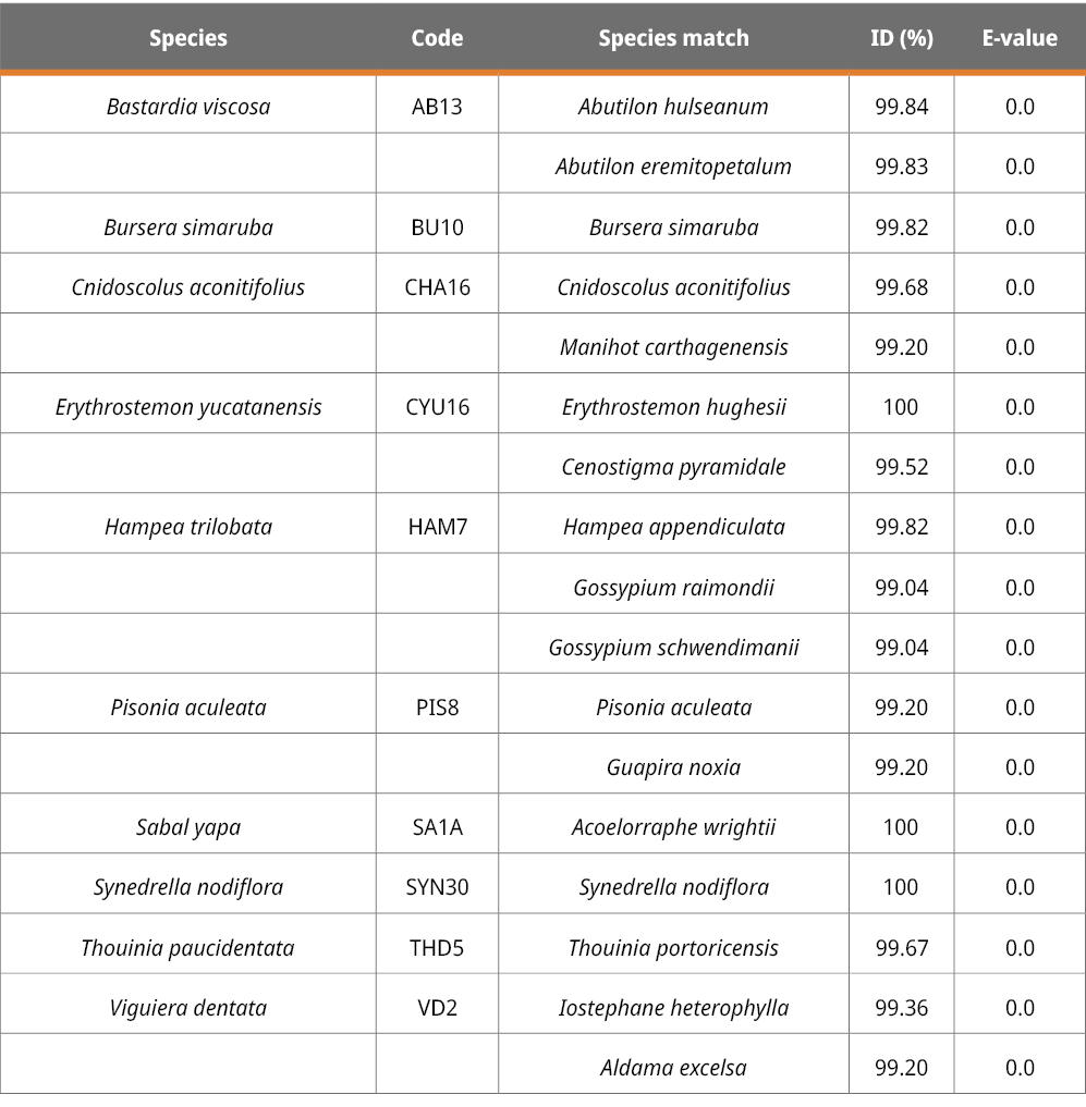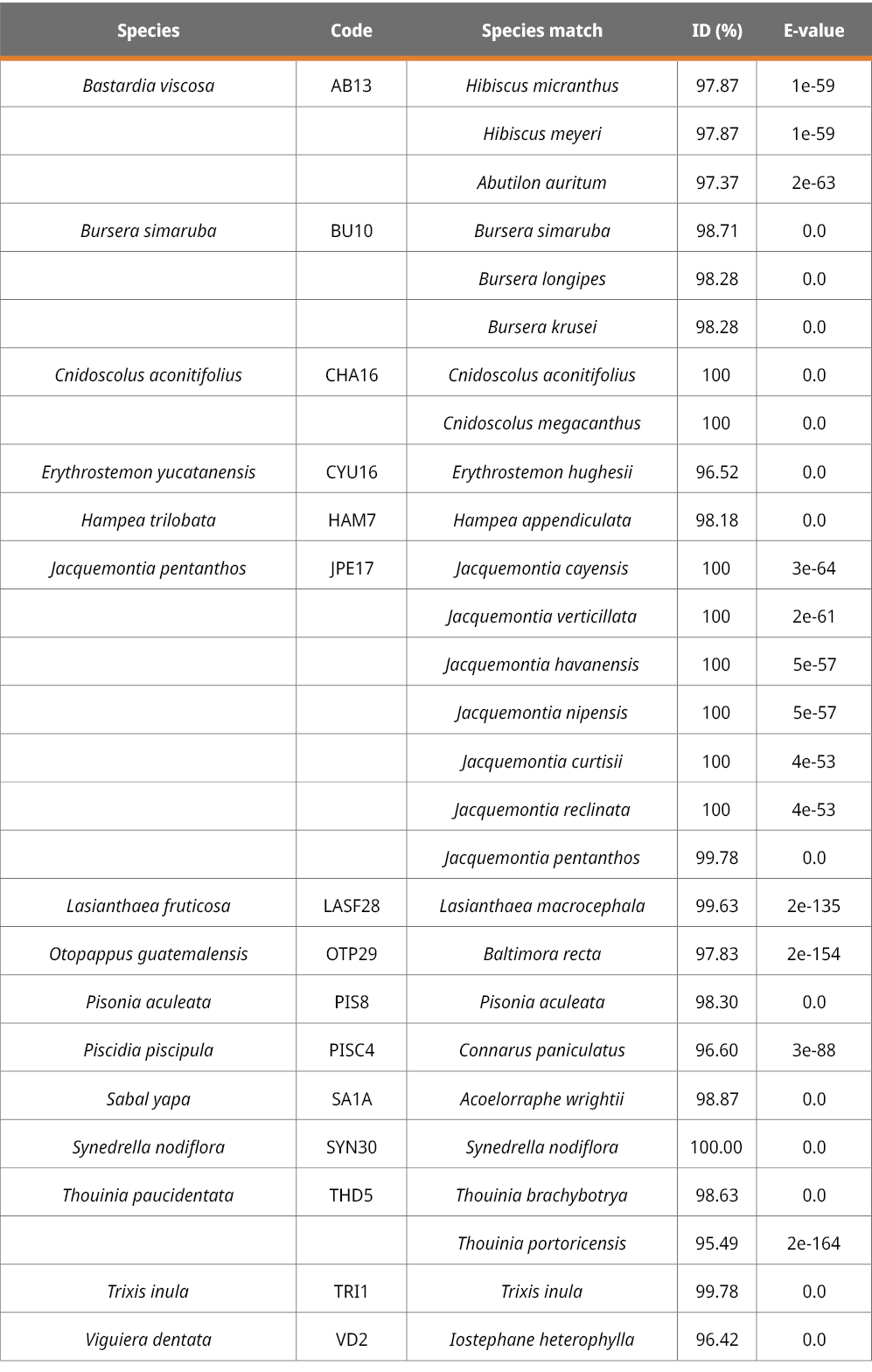 Hollingsworth et al. (2009) have reported obtaining high-quality bidirectional rbcL sequences like those we got in our study (100 %). In some species, secondary metabolites can interfere with the DNA extraction causing PCR amplification and sequencing failures (Bafeel et al., 2011; Kang et al., 2017). That was probably the case for Mimosa bahamensis (trnH-psbA), Cnidoscolus aconitifolius (ITS2), and Sabal yapa (ITS2), where purity indicators A260/280 and A260/230 were lower than 1.8.