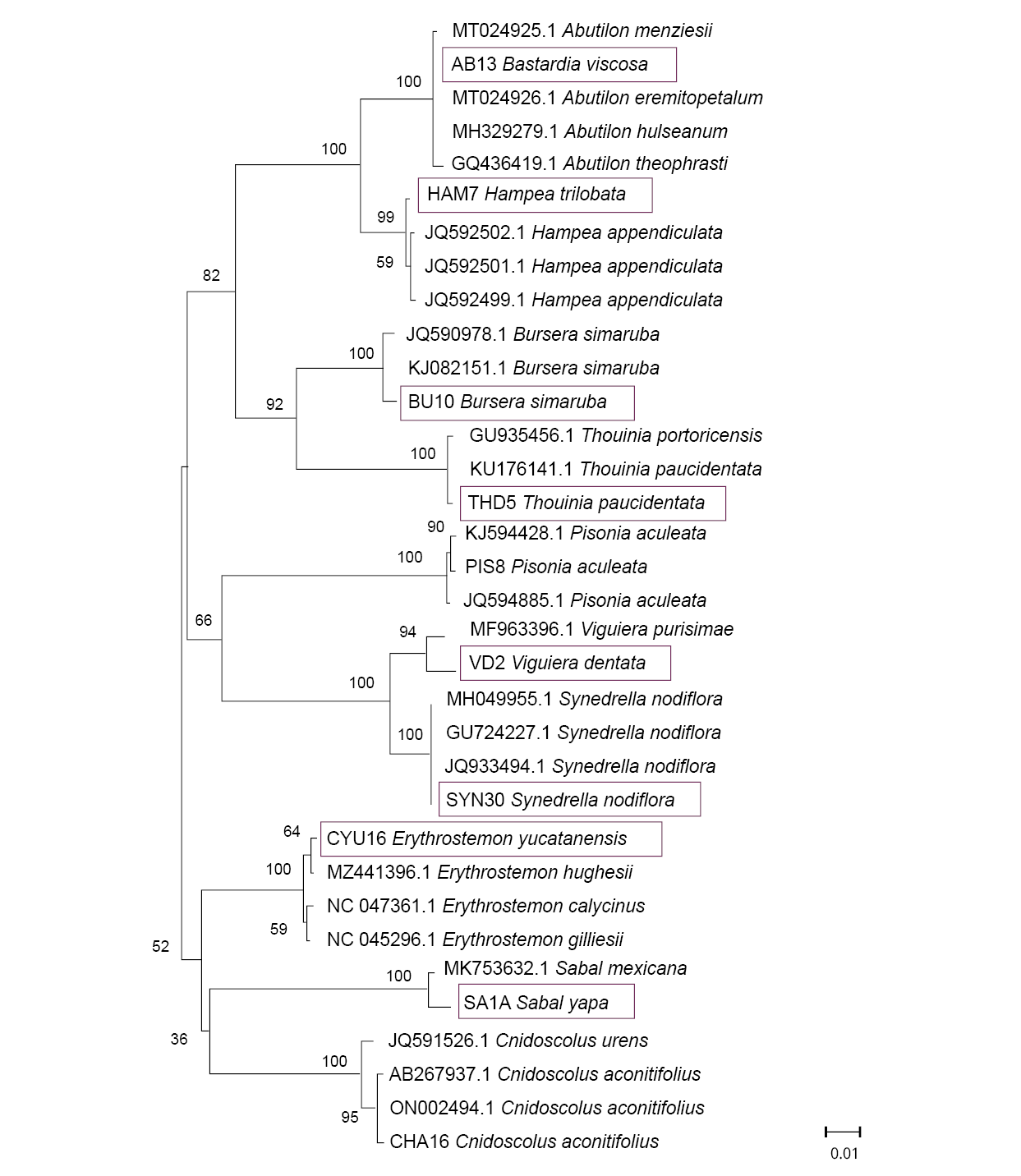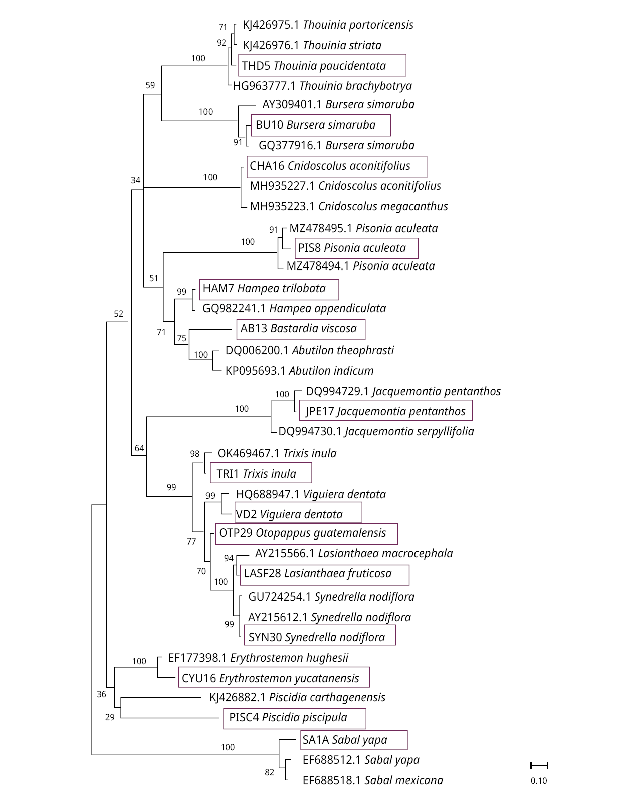 Regarding DNA sequencing, the success rate of sequencing was 100 % for rbcL, followed by trnH-psbA (88.9 %) and ITS2 (87.5 %). In all cases, amplification products of the expected size were obtained. The average length of the rbcL sequences was 631 bases, ITS2 of 473 bases, and trnH-psbA of 509 bases. The latter fragment exhibited a variation in the length of the sequences between species. Although Sabal yapa and Cnidoscolus aconitifolius amplified for ITS2, overlapping peaks were found in sequencing results and could not be used for further analysis. The same occurred with Mimosa bahamensis with the trnH-psbA fragment, where the electropherograms were unclear.