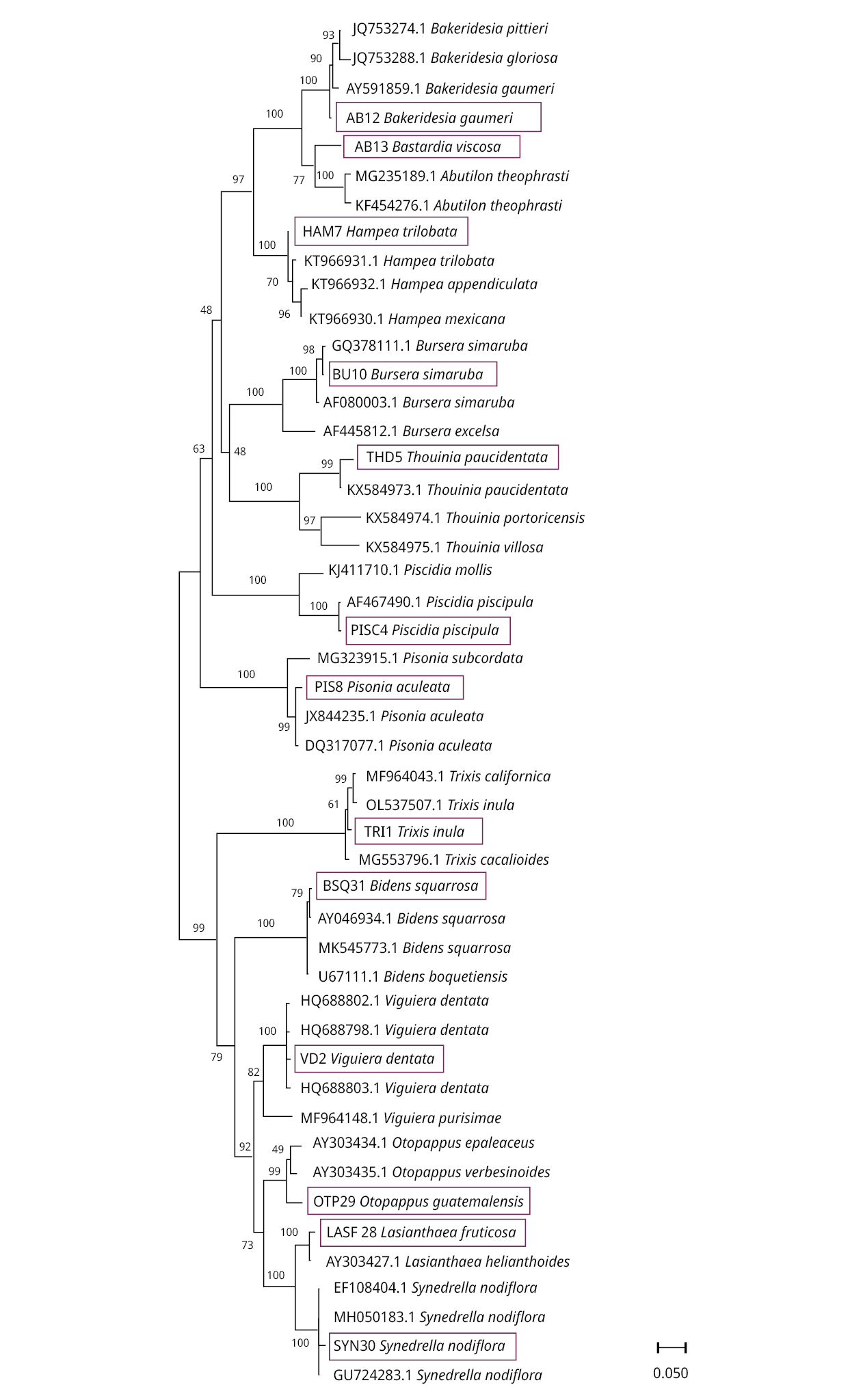 When distance methods were used for species identification, Neighbor-Joining trees showed our sequences cluster correctly with GenBank sequences for the same species or genus (in a few cases with the same family members). The rbcL sequences were correctly grouped by genus except for Bastardia viscosa, which was grouped with other Malvaceae species because it does not have reference sequences in GenBank (Figure 1). The tree size for ITS2 is larger than for the other two markers due to the availability of reference sequences for the organisms studied (Figure 2). Although the species identification efficiency of trnHpsbA using BLAST was low, species for med well-defined groups in trees. Since Otoppapus guatemalensis has no reference sequences for trnH-psbA in GenBank, the sequence clustered with other species of Asteraceae but on a different branch within the tree (Figure 3).