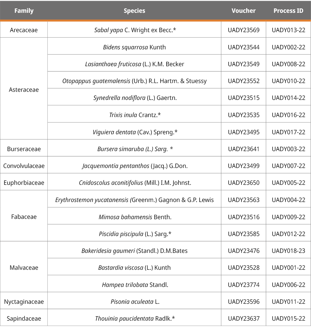 Eighteen species were selected according to the melissopalynological analysis of Sabal yapa honey from Tizimin, Yucatan (Durán-Escalante et al., 2023) (Table 1). Seven of these species were the major contributors of pollen to Sabal yapa honey and are also the major plant contributors to honey production in the Yucatan Peninsula (Alfaro-Bates et al., 2010). Four species provided pollen categorized as minor or important minor pollen, and seven species are part of the group that we consider can help to give certainty to the pollen grains that could only be identified by palynology at the botanical family level (i.e., Malvaceae, Asteraceae) in Sabal yapa honey. The plants were gathered around the apiaries of a local beekeeper where this honey is harvested. Lately, the dried specimens were identified by expert taxonomists and deposited in the herbarium of the Universidad Autónoma de Yucatán (UADY). The specimens are available online in the portal of the Red de Herbarios del Noroeste de México (2023).