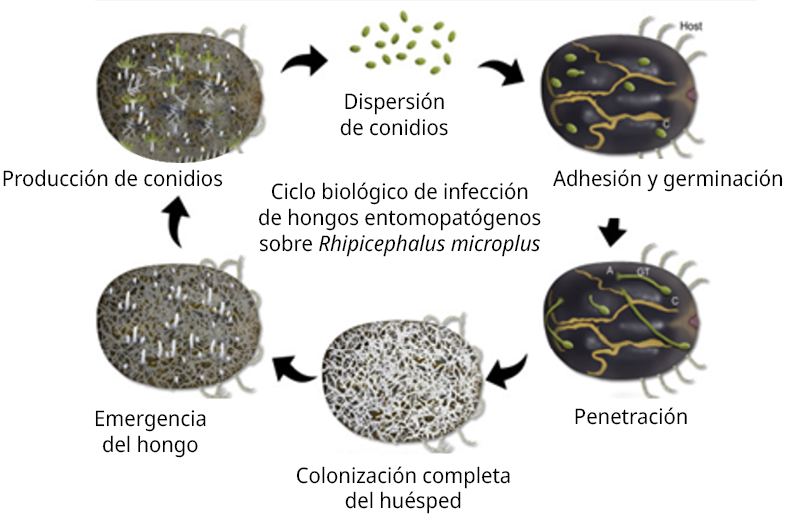 Los síntomas de patogenicidad fúngica en garrapatas incluyen sensibilidad reducida, movimientos descoordinados y parálisis, que conducen a la muerte del artrópodo. Al ser hemibiótrofos, continúan viviendo en el cadáver como saprófitos, las hifas invaden órganos internos hasta agotar los nutrientes y luego, en condiciones favorables, emergen y forman nuevamente las esporas (Esser et al., 1994, Carballo y Guharay, 2004), las que podrán diseminarse por el ambiente para recomenzar el ciclo en otros individuos. En la Figura 1 se presenta dicho ciclo en forma esquemática.
