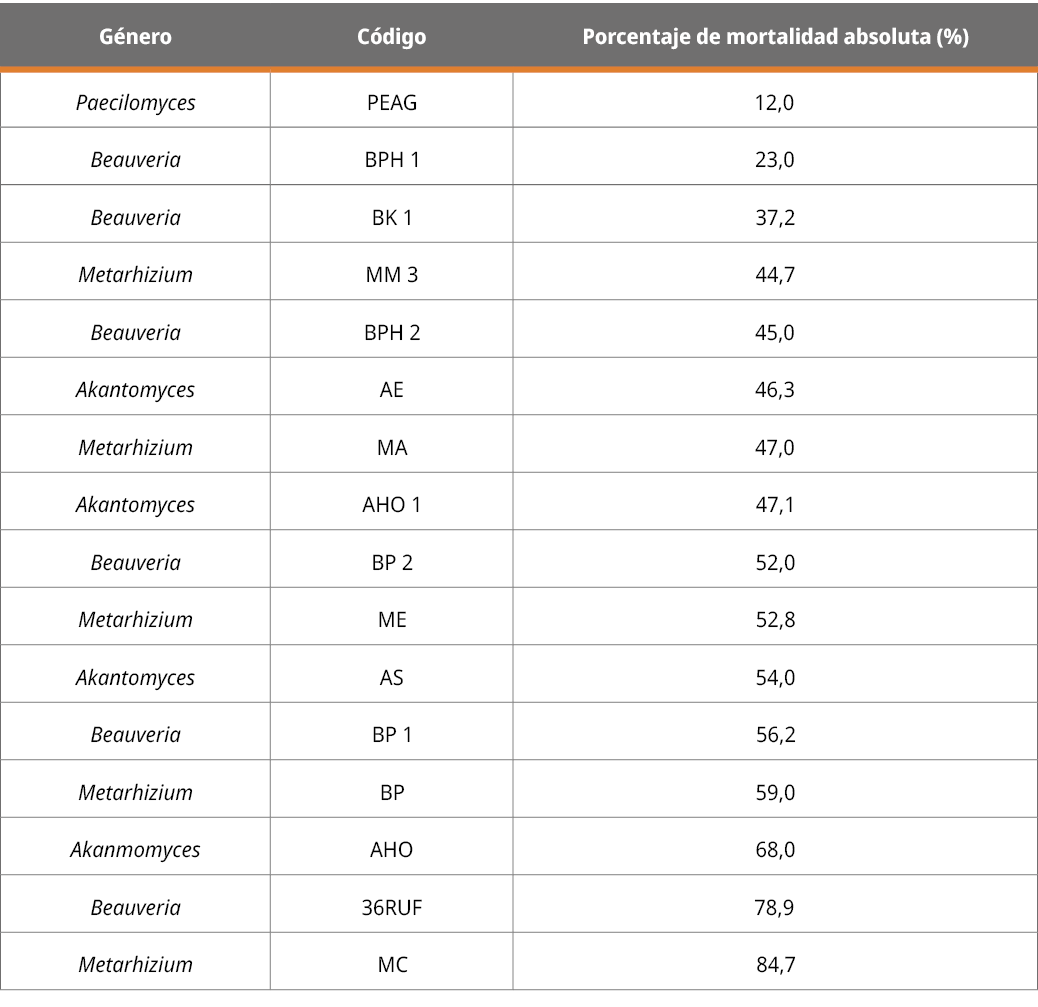 Palabras clave: Metarhizium anisopliae, Akantomyces muscarius, Beauveria bassiana, control biológico, microorganismos nativos.