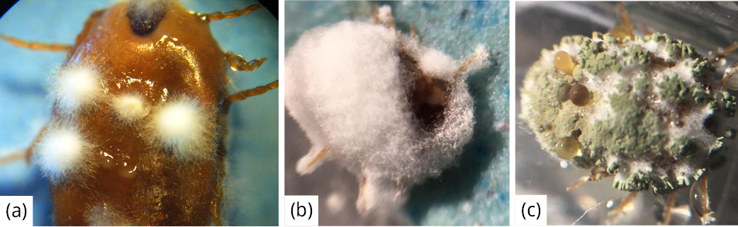 Figura 2. Garrapata adulta infectada con (a) Akantomyces muscarius, (b) Beauveria bassiana y (c) Metarhizium anisopliae.
