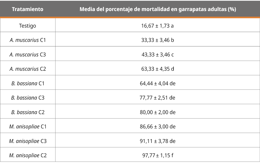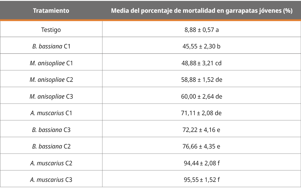Sobre garrapatas menores a 4 mm se observan diferencias significativas (p < 0,05) en todos los tratamientos en relación con el testigo. El mayor efecto de patogenicidad visible a través de la mortalidad corresponde a la cepa de A. muscarius en las dos concentraciones más altas (107 y 108 con/mL), sin diferencias significativas entre estas dosis y con diferencias significativas de los demás tratamientos. B. bassiana y M. anisopliae en las concentraciones más altas (107 y 108 con/mL) no mostraron diferencias significativas con A muscarius en su dosis más baja, concluyendo que A muscarius es la cepa más patogénica sobre garrapatas de menor desarrollo.