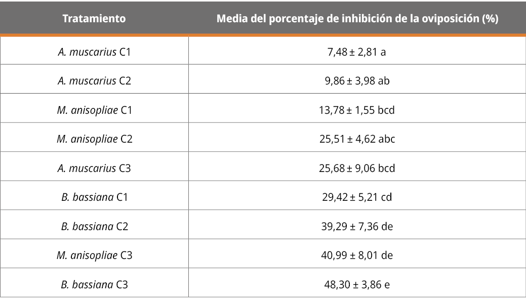 Los resultados, tal como se observa en Tabla 4, muestran que todos los aislamientos en las diferentes concentraciones (con excepción de la menor concentración de A. muscarius) presentan diferencias significativas en la inhibición de oviposición respecto al testigo. El resultado de la cepa de B. bassiana concuerda con los autores Yari Briones et al. (2021), quienes también reportan la capacidad inhibitoria de esta especie sobre la oviposición. Asimismo, autores como Fernandez-Salas et al. (2017) destacan el efecto de M. anisopliae en la reducción de la masa de huevos, considerándolo muy importante pues de esta forma se reducen las poblaciones o infestaciones en el campo.