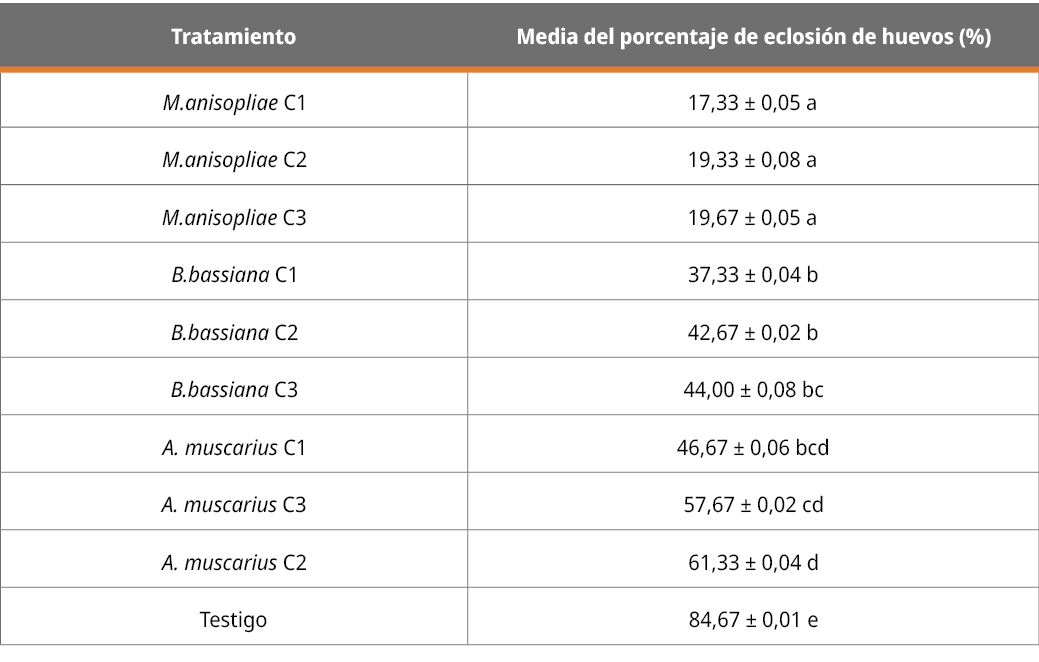 Los resultados del efecto de los tratamientos sobre el nacimiento de larvas muestran que todos los aislamientos en las diferentes concentraciones fueron capaces de inhibir la eclosión de garrapatas con diferencias significativas (p < 0,05%) respecto al testigo. El tratamiento con M. anisopliae fue el que más influyó en este parámetro, sin diferencias significativas según las concentraciones y con diferencias significativas en relación con los demás tratamientos de las otras cepas en cualquiera de sus concentraciones. Estos resultados corroboran la información de López et al. (2009) sobre el efecto de M anisopliae en la disminución de nacimientos de larvas.