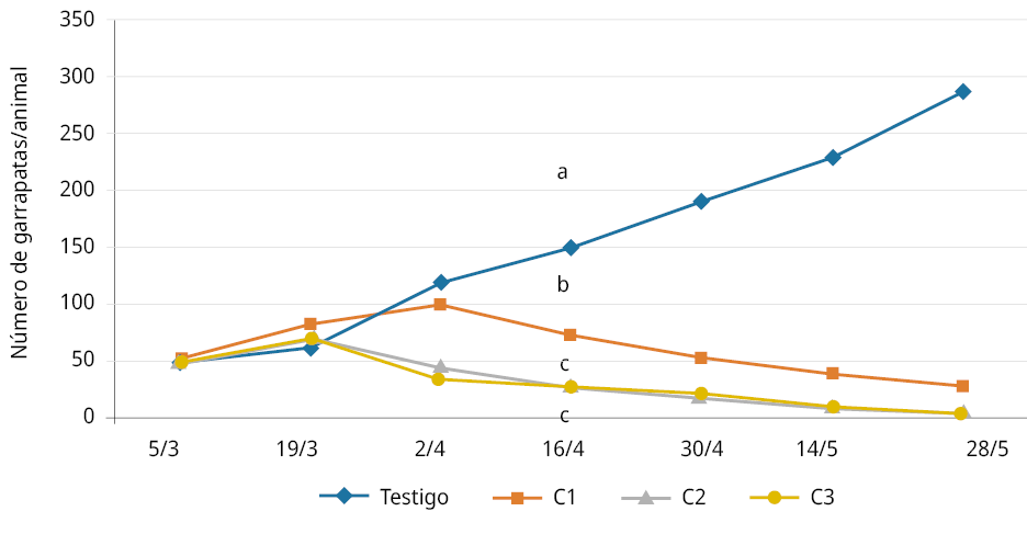 Para evaluar la población de garrapatas sobre los vacunos (como indicador de la evolución de la población de garrapatas con los diferentes tratamientos) se contabilizó cada 15 días, previo a cada aplicación, el número de garrapatas mayores a 4 mm del lado izquierdo de cada animal, por cada grupo.