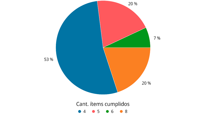 Figura 1. Porcentaje (%) del total de las muestras analizadas (n=150) versus cantidad de ítems cumplidos (4, 5, 6 y 8) según el Artículo 7 del Decreto 403/016 del MSP (Uruguay, 2016).