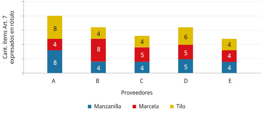 Se destaca el proveedor A sobre el resto en cuanto al cumplimiento en el rotulado para las tres hierbas en estudio. Sin embargo, en general se observa un bajo cumplimiento en el rotulado de los envases primarios comercializados.