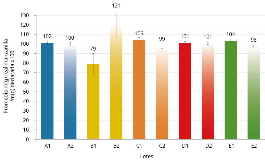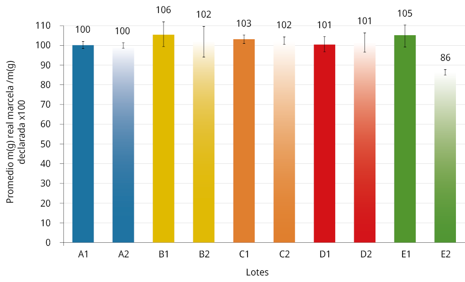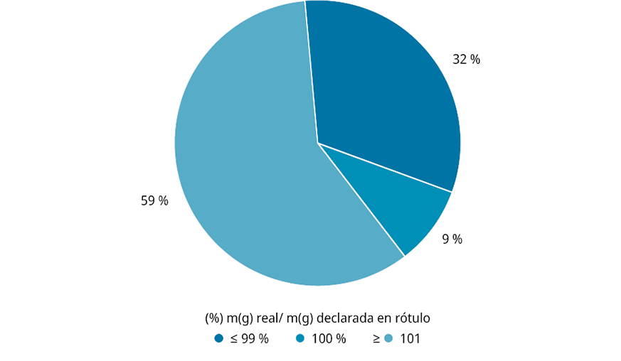 La normativa vigente no establece la tolerancia (desviación asociada) a la masa que debe contener cada paquete. Sin embargo, es buena práctica de control de calidad que lo que se exprese en el rotulado se encuentre en el contenido, asegurando un buen control de calidad y, por ende, confianza al consumidor final. De la Figura 3 se observa que el 59 % de las muestras estudiadas presenta un porcentaje mayor e igual al 101 %. Un 32 % contiene menos de lo que declara, y a su vez tan solo el 9 % de las 150 muestras estudiadas contienen el mismo contenido que el que declaran.