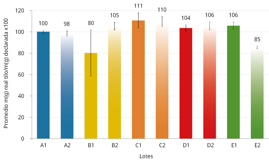 Figura 6. Promedio del porcentaje de masa (g) real de tilo respecto a la masa (g) declarada versus lotes de proveedores.