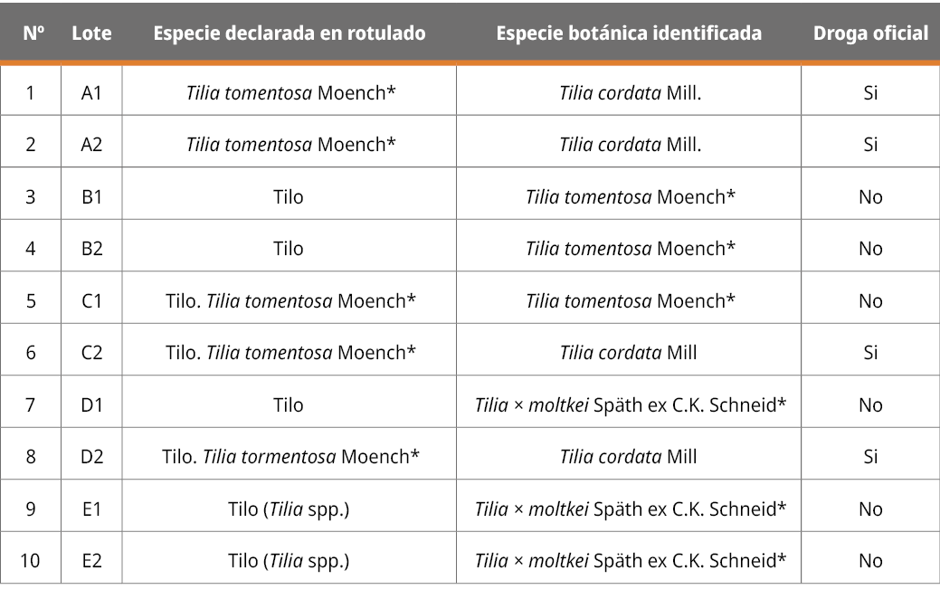 La droga vegetal en tilo (Lime flower-Tiliae flos) consiste en las inflorescencias enteras y secas de las especies: Tilia cordata Mill., T. platyphyllos Scop. y T. ×vulgaris Hayne o una mezcla de estas (Council of Europe, 2011a). Las especies que no se contemplan en la monografía específica para la droga vegetal en cuestión se consideran adulterantes (y fueron representadas con un asterisco en la Tabla 3) (Organización Mundial de la Salud, 1998). La Tabla 3 resume la especie que declara el rotulado y la especie identificada para los 10 lotes de tilo analizados.