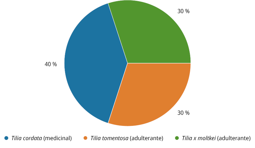 Es de resaltar que 10 de las 50 muestras de tilo in natura analizadas (proveedor A) declaran tener una especie que no contiene, y que además no se trata de la especie medicinal según la Farmacopea Europea. Sin embargo, la especie identificada en los envases fue identificada botánicamente como Tilia cordata Mill., siendo esta una de las especies de Tilia sp. consideradas medicinales por las Farmacopeas.