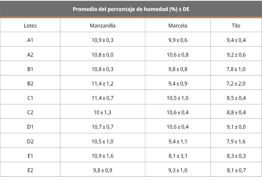Sin embargo, los valores obtenidos no pueden ser comparados con las especificaciones aportadas por las monografías sobre pérdida por secado, para tilo, manzanilla y marcela, ya que no se utilizaron los métodos oficiales que se declaran en las mismas para este parámetro fisicoquímico (Council of Europe, 2011; Council of Europe, 2011a; Brasil. Agência Nacional de Vigilância Sanitária, 2019c).