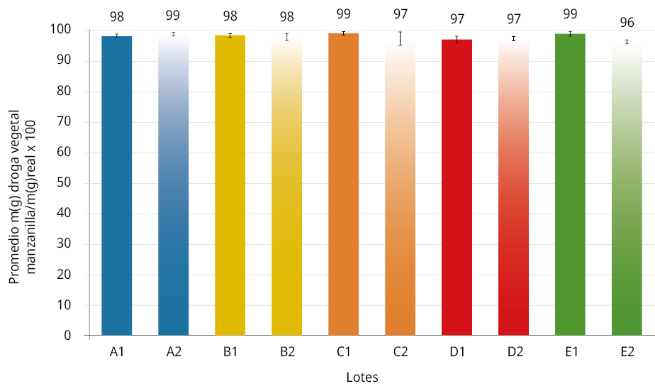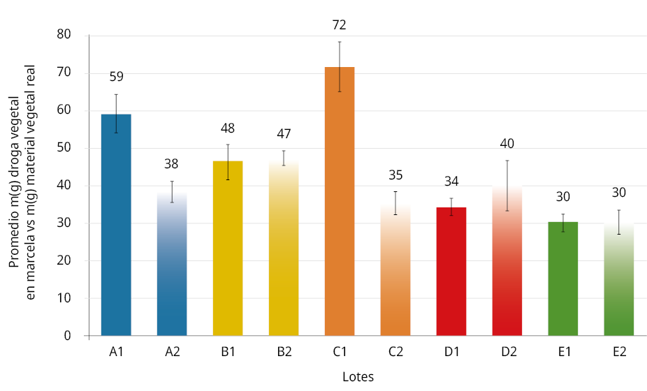 Para Achyrocline spp., existe una mayor variabilidad del contenido de droga vegetal inter e intralotes (p - value = 5,1 x 10-19 α = 0,05), por lo que las medias del promedio de droga vegetal versus masa real del material vegetal entre los lotes no son todas iguales, y existe diferencia significativa entre ellas. Se destaca en ocho proveedores un promedio menor de 50 % de la misma. El resto se considera materia extraña, según la normativa. Por lo tanto, ningún proveedor cumple con el máximo requerido de este parámetro.