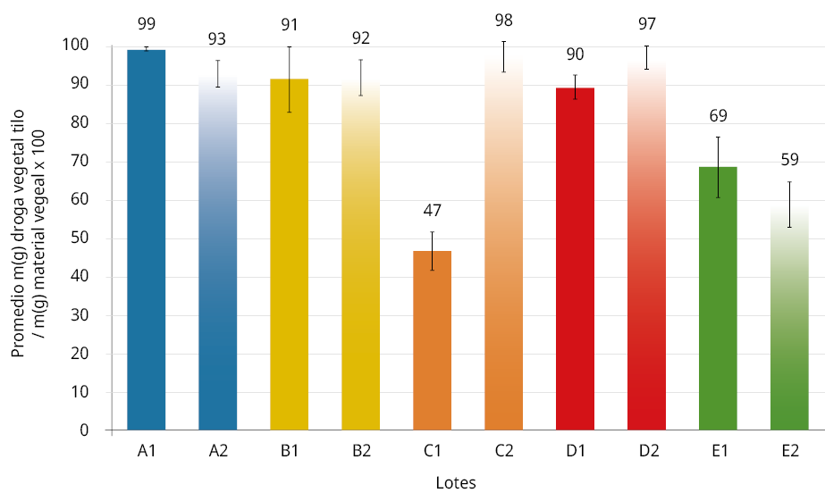 En tilo, las inflorescencias en las especies medicinales son la droga vegetal. Considerando solo el porcentaje de la droga vegetal en el total de la muestra vegetal analizada por envase, se obtiene la Figura 10, la cual evidencia una diferencia significativa entre las medias de los lotes estudiados (p - value = 7,6 x 10-16, α = 0,05).