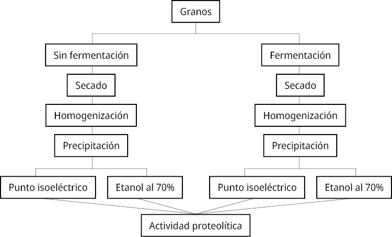 Con el objetivo de obtener los extractos proteicos se utilizaron dos métodos de precipitación: con etanol y por punto isoeléctrico. La precipitación se realizó con semillas sin fermentar y con semillas fermentadas a fin de comparar rendimientos (Figura 1).