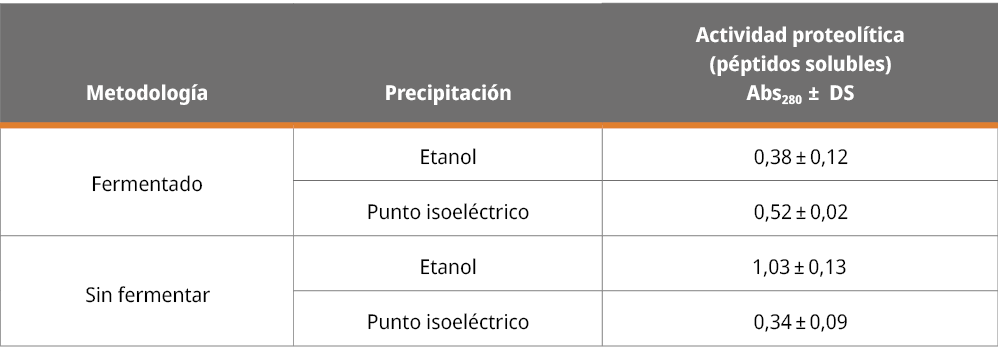 En lo que respecta a los bajos valores encontrados en las semillas fermentadas, debe estar asociado directamente a la actividad biológica de los microorganismos. Tal como lo explica Granito et al. (2002), durante el proceso de fermentación se reduce sustancialmente el contenido de algunos factores antinutricionales presentes en la semilla (como los inhibidores de proteasas), estimulando la actividad de las enzimas proteolíticas presentes en la semilla, lo que podría producir una disminución en la recuperación de la actividad enzimática.