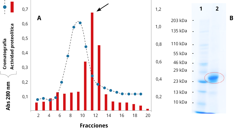 En lo que respecta a la electroforesis (Figura 2B), se observan varias bandas entre el intervalo de 25 y 30 kDa. Ese bajo peso molecular es el esperado para enzimas hidrolíticas con actividad proteolítica. El resultado coincide con lo encontrado por Abdala et al. (1999), quienes aislaron una aminopetidasa a partir del Phaseolus vugaris, con un peso molecular cercano a los 30 kDa y un pH óptimo de 7; y lo hallado por Budič et al. (2016), quienes aislaron una enzima proteolítica del tipo serin proteasa a partir del Phaseolus vugaris con un peso molecular de 37 kDa. Esto demuestra que el proceso de purificación diseñado fue efectivo.