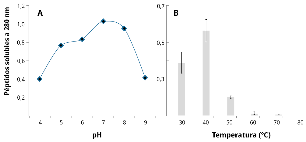 En lo que respecta al efecto de la temperatura sobre la actividad (Figura 3B), como se utilizaron valores de temperaturas con una variación de 10 °C, es posible sugerir que las proteasas tienen una máxima estabilidad entre un intervalo de 35 y 45 °C. Este resultado difiere de los encontrados por Asif-Ullah et al. (2006), quienes aislaron una proteasa de Cucumis trigonus y su óptimo de temperatura fue de 70 °C. Sin embargo, el resultado obtenido en el estudio concuerda con el sugerido por Antão y Malcata (2005) para este tipo de enzimas, pues estos autores sugieren que la temperatura óptima está entre 20 y 50 °C.