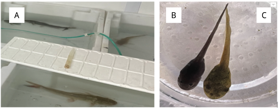 Figura 1. Organismos utilizados para el ensayo. Depredadores, A: peces autóctonos de bagre negro (Rhamdia quelen) y presas: B: larva de rana criolla (Leptodactylus luctator) y C: larva de rana toro (Aquarana catesbeiana).