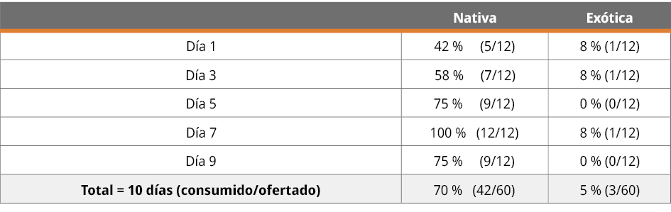 Tabla 1. Distribución del consumo de larvas por día de alimentación, indicando frecuencia absoluta y porcentaje.