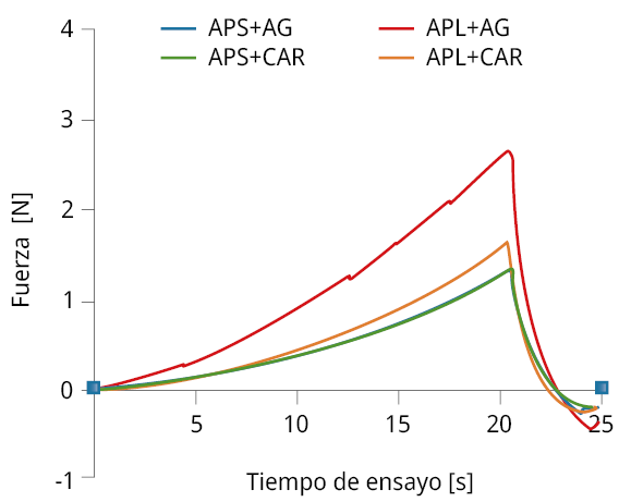 Para determinar la dureza de los geles se aplicó un análisis de compresión utilizando un texturómetro (Z0.5, Zwick, Alemania). Este análisis consiste en la compresión perpendicular de la muestra hasta un 20 % de su altura original, obteniéndose una curva de fuerza de compresión en el tiempo a partir de la cual se determinó el parámetro dureza (fuerza de gel/área). Para ello, se utilizó una sonda de 5 cm de diámetro y una velocidad de 0,1 mm/s. Cabe destacar que todos los geles tenían la misma forma cilíndrica (3,6 cm de diámetro y 1,25 cm de altura) antes de la compresión.