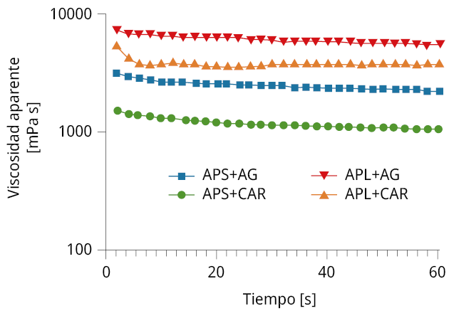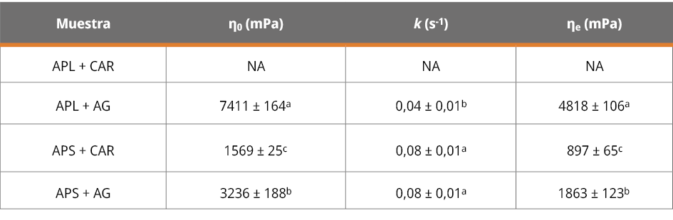 Las curvas de viscosidad aparente durante el tiempo se ajustaron a un modelo de destrucción estructural (R2: 0,98-0,99), encontrándose diferencias significativas (p < 0,05) en los parámetros cinéticos ( n0 viscosidad aparente inicial, ne viscosidad aparente en el equilibrio y k constante de velocidad de destrucción estructural) entre los geles con diferente composición (Tabla 4). Cabe destacar que la muestra APL-CAR no tuvo un buen ajuste al modelo de destrucción estructural (R2 < 0,2), por lo cual no se determinaron sus parámetros cinéticos. Como era de esperar, los geles presentaron diferencias significativas (p < 0,05) en los valores de viscosidad aparente inicial (η0), lo cual concuerda con los resultados anteriores (Figura 3). Las muestras APL + AG y APS + AG presentaron los mayores valores de η0, lo cual se puede deber a un sinergismo del agar en la reología de los geles.