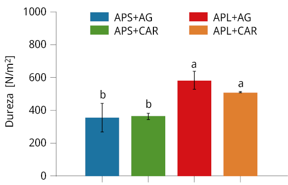A partir de la curva de fuerza de gel, se determinaron los valores del parámetro dureza (Figura 5). En primer lugar, se identificó que el tipo de proteína utilizada tuvo un efecto significativo (p < 0,05) sobre la dureza de los geles, donde los geles con APL exhibieron los mayores valores (509-586 N/m2) en comparación con los elaborados con APS (354-363 N/m2) (Figura 5). Tal como se mencionó anteriormente, esta tendencia se puede deber a las diferencias en las interacciones proteicas durante la gelificación de las muestras. En el caso de los geles con APL, predominan las interacciones hidrofóbicas y los enlaces de puente disulfuro, los cuales aumentan la resistencia del gel (Alavi et al., 2018). Mientras que los geles de APS presentan interacciones débiles entre sus cadenas, lo cual reduce la rigidez de la red del gel (Siegwein et al., 2011).