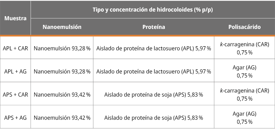 Los geles basados en nanoemulsión se prepararon con una mezcla de hidrocoloides como agentes gelificantes (proteínas: aislado del lactosuero-APL y aislado de proteína de soja-APS y polisacáridos: k-carragenina-CAR y agar-AG), la cual se adicionó a la NE base. La nomenclatura y formulación de las muestras se presentan en la Tabla 1.