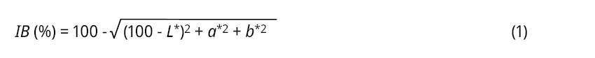 Las propiedades ópticas de los geles se determinaron mediante un colorímetro (MiniScan XE Plus, HunterLab, EE.UU.), donde se obtuvieron los parámetros del espacio de color CIELab. Antes de comenzar las mediciones, el colorímetro se calibró utilizando un fondo blanco y negro. Luego, se añadieron 25 g de cada muestra en placas Petri transparentes cubriendo toda la superficie de la placa de forma uniforme. Se obtuvieron los valores de los parámetros L* (claridad), a* (componente rojo-verde) y b* (componente azul-amarillo), y se calculó el índice de blancura (IB) utilizando la Ecuación 1 propuesta por Ullah et al. (2018).