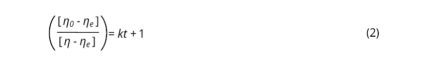 Donde n0 es la viscosidad aparente al t = 0, ηe es la viscosidad aparente en el equilibrio t→∞, k es la constante de velocidad de destrucción estructural y t es el tiempo de cizallamiento.