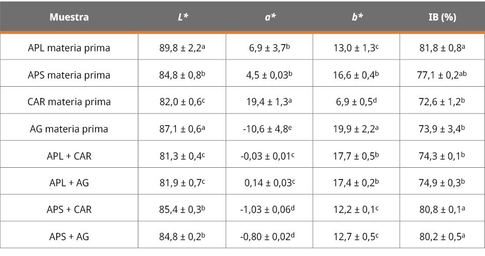 Nota: APS: aislado de proteína de soja, APL: aislado de proteína de lactosuero, CAR: k-carragenina, AG: agar, L*: claridad, a*: componente rojo-verde, b*: componente azul-amarillo, IB: índice de blancura. Cada valor representa la media ± SD. Diferentes superíndices indican diferencias significativas entre las muestras (test de Tukey; p < 0,05).
