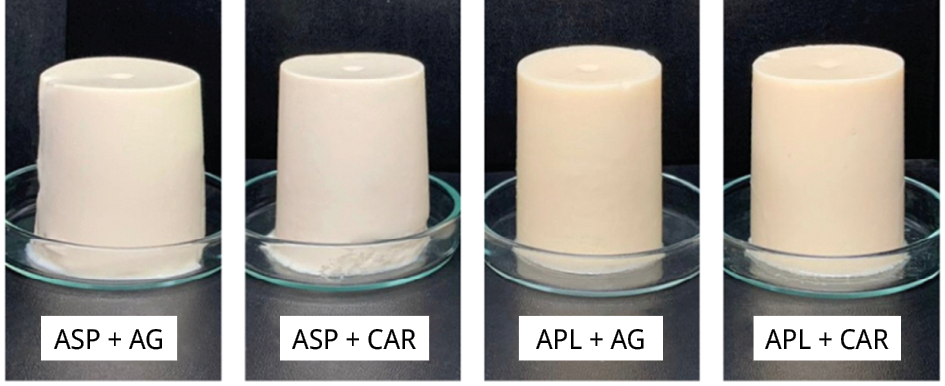 Figura 1. Fotografías de los geles basados en nanoemulsión elaborados con mezclas de hidrocoloides. Nota: APS: aislado de proteína de soja, APL: aislado de proteína de lactosuero, CAR: k-carragenina, AG: agar.