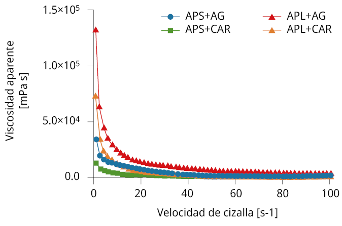 Con el fin de comparar las muestras se determinó la viscosidad aparente a diferentes velocidades de cizalla (10, 50 y 100 s-1), donde se observaron diferencias significativas (p < 0,05) entre las muestras, según el tipo de proteína y polisacárido (Tabla 3). De forma general, los geles elaborados con APL presentaron valores de viscosidad aparente más altos que aquellos con APS, a todas las velocidades de cizalla estudiadas. Este resultado indicaría que el APL presenta interacciones proteína-proteína más fuertes que el APS (Lin et al., 2021), lo que aumenta la resistencia a fluir de los geles. Las interacciones moleculares del APL se deben a la presencia del grupo tiol libre (-SH) en su composición aminoacídica, lo cual facilita la agregación y gelificación de las proteínas desnaturalizadas (Zhang et al., 2023). En cambio, el APS presenta interacciones proteína-proteína débiles debido a la ausencia de aminoácidos azufrados en su composición (Qin et al., 2022).