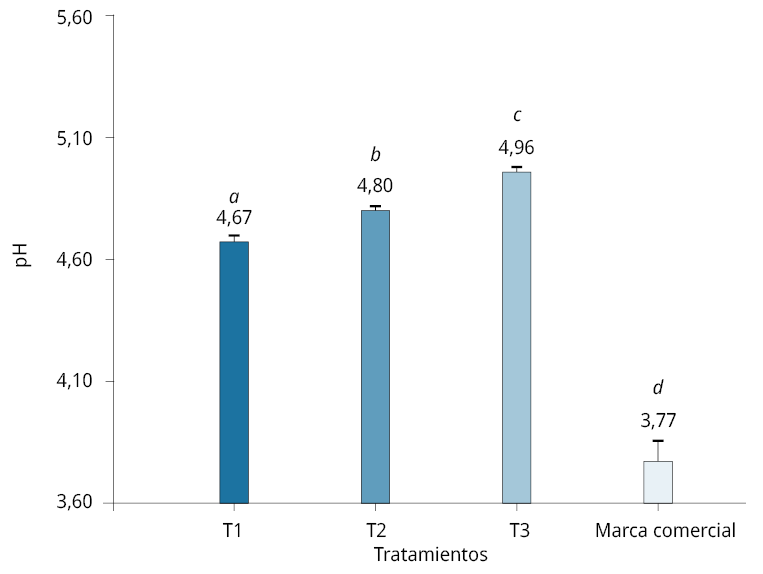 Figura 1. Resultados obtenidos en la variable pH. Letras diferentes representan diferencias significativas (p < 0,05) ± Desviación estándar.